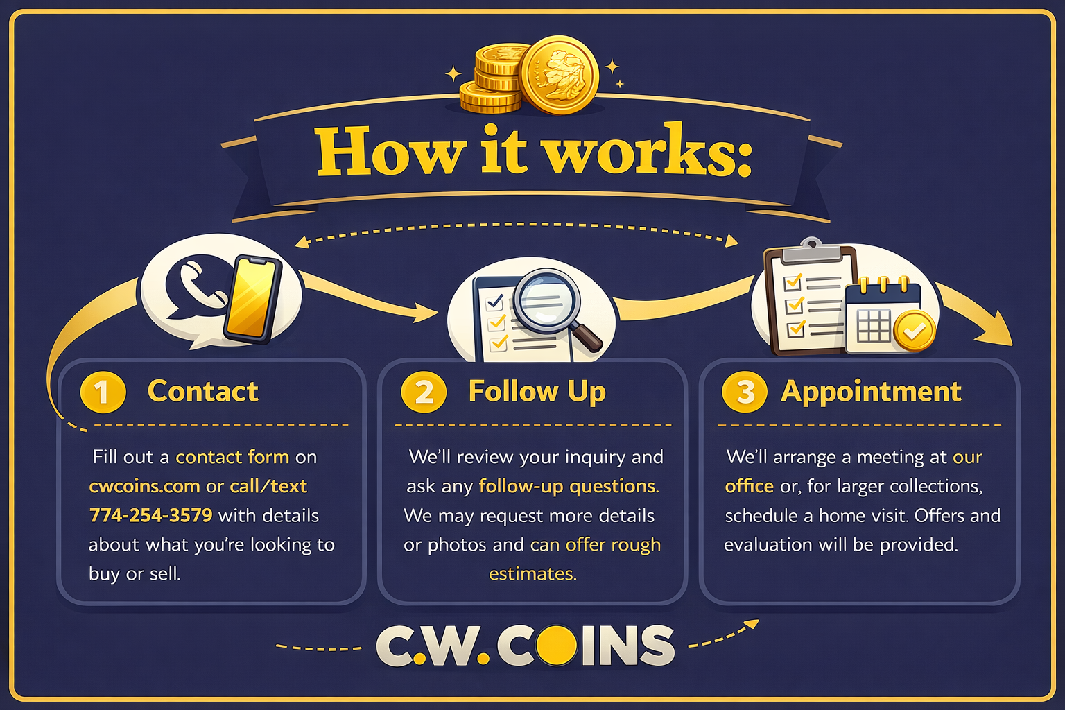 Buying or selling - we can help! Fill out a contact form on cwcoins.com or call/text 774-254-3579. Provide relevant information regarding what you’re looking to buy or sell.